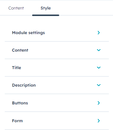 Style settings gives you options to customise the look of module settings, content, title, description, buttons and form.