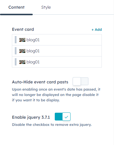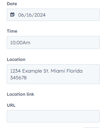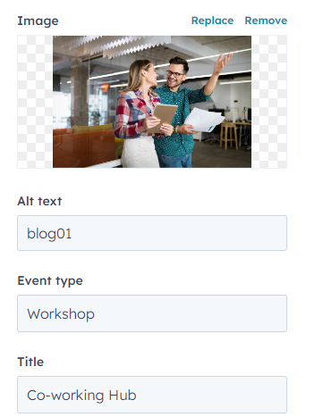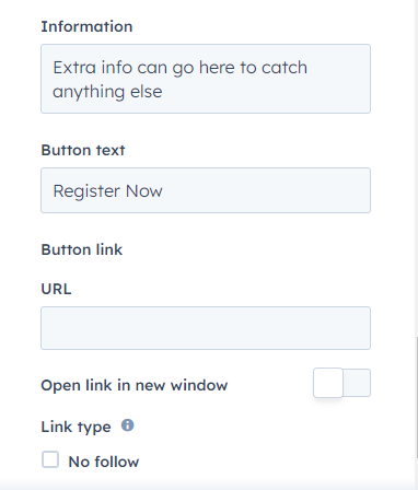 In event card settings, you can customise the image event type, title, description, date, time information location, location link add a button content.