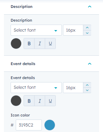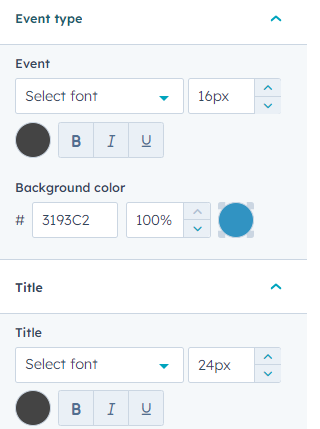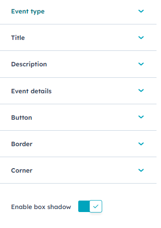 you can customize event type settings in color, and title, description, event details, button customize seettings, border, corner, and box shadow