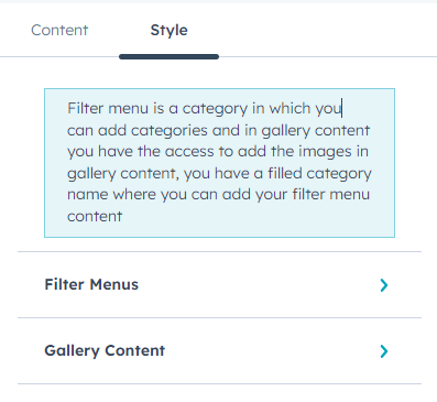 You can customise the module’s gallery design, filter menus and gallery content from style features.