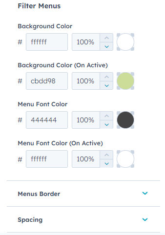 Customise filter menu’s colours, borders and spacing from filter menus settings.