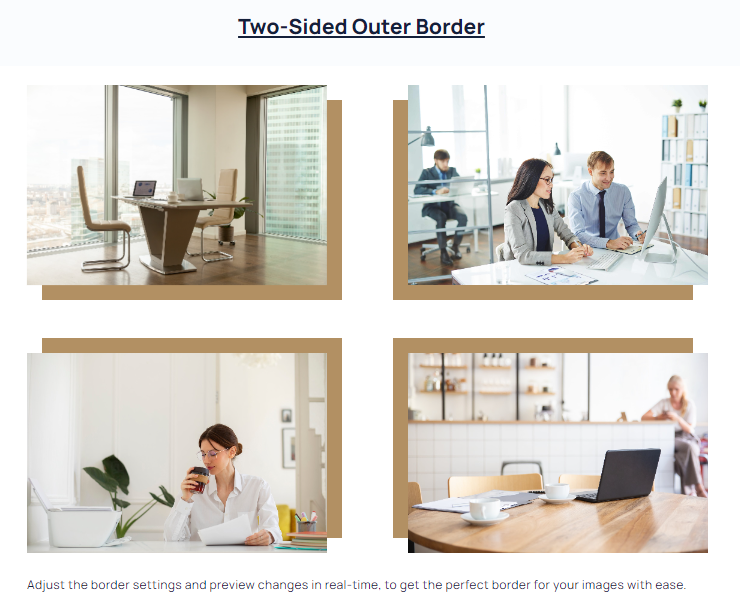 This is a versatile feature that enables you to add customised borders to the images. You can enable or disable borders and adjust various advanced settings such as border color, border alignment, and corner radius.