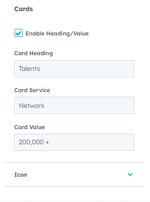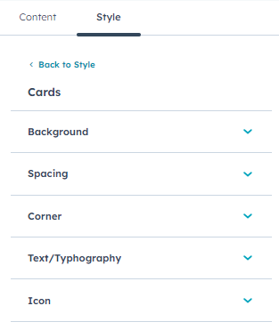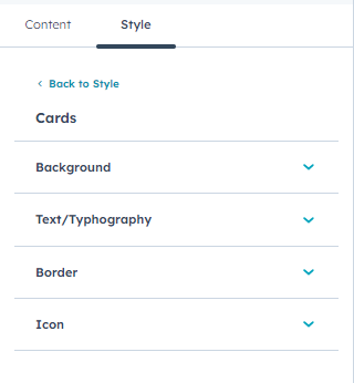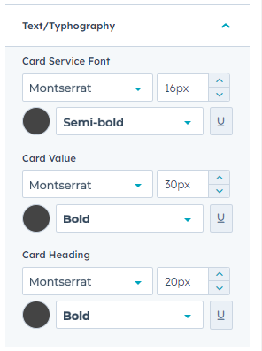 Variant 1 cards settings has options to customise card’s background, spacing, corner, text/typography and icon.