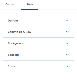 Customise the designs, column in a row, background, spacing and cards in the style settings of variant 1.